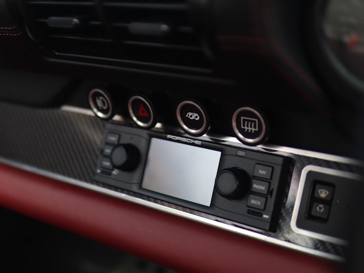 Getting into the car you immediately notice the completely retrimmed interior. The dash displays an exposed carbon fibre panel, but there are actually more unseen carbon fibre panels in the interior as they are covered by leather. A retro-looking head unit with all the latest gadgets such as iPhone connect and Bluetooth sits nicely in the middle of the dash. Look a little upwards and you see a sports exhaust button, just like the ones in modern Porsche’s, which allows you to make the car louder when needed. While I will later find out that the car is plenty loud enough as it is, the sport exhaust button is nevertheless a very neat modification which combines a popular modern function with an old car.