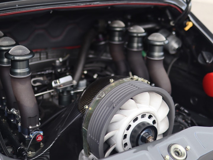 All Theon Design 911’s come with fully adjustable KW suspensions. HK001 in particular also has the hydraulic front lift system which is helpful for compact cities like Hong Kong. No carbon brakes are needed for such a light car, so instead larger 964 Turbo brakes are used. The original 964 Carrera weighs about 1,400KG dry while the Theon Design 911 weighs about 1,100KG, shedding off around 250KG. To achieve this, aside from the extensive use of carbon fibre for the body panels, engine bay, and interior, Theon Design also gotten rid of a lot of unnecessary parts. For example, HK001 originally started life as a Carrera 4, but the car is now rear wheel drive only. What is impressive is the weight ratio is now 43:57, much improved from the original car. Theon Design achieved this by moving certain parts around, such as moving the heavy AC and power steering pumps from the rear to the front.