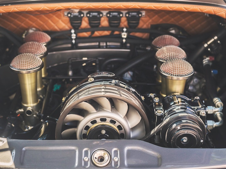As with all Singers, all the body panels, aside from the doors, have been replaced by carbon fibre panels. The wheels are wide retro-Fuch wheels to go with the widened rear fenders. The brakes are original 993 Turbo brakes which is more than ample for the lightweight car (Singer says they saved 500 pounds from the original 964). For the engine, Singer retains the original 964 block but increased the capacity to 4.0 along with other internal enhancements. As a result, the car has about 390 horsepower now. Singer claims that all their cars would at most only have a 3 horsepower discrepancy as all Singer engines were tuned meticulously. Most Singers have an intake manifold taken from the 997 GT3 which, while it looks great, I always thought it did not look period correct. However, by the time this owner started picking options for his Singer, Singer released their “Velocity Stack Trumpet” intakes which look superb and are much more fitting optically.